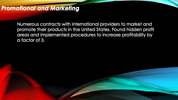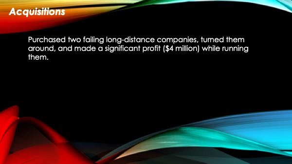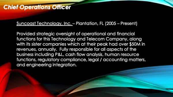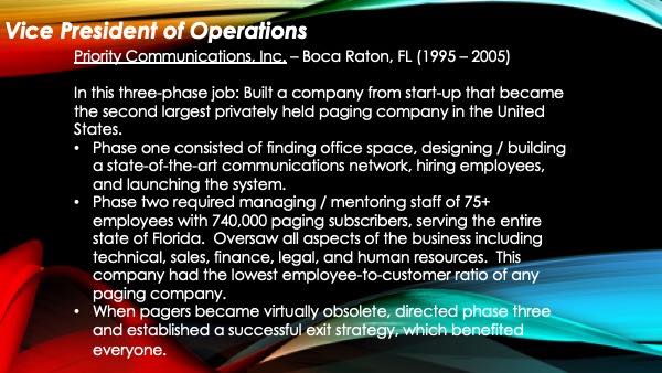 With minimal direction from previous investors, my previous work experience covers every aspect of running a company. On the financial side I had full responsibility of the P & L’s, along with planning and keeping to budgets, long range forecasting, statistical analysis of all data, bank float, and keeping a high ROI for the investor. In managing people, I not only led by example, but also had the full respect of all employees because of my knowledge, communication skills, and the respect I gave them. For the latter part of my career I have managed multi-million dollar telecommunication companies, which have exposed me to every type of technical and financial challenge one may find.