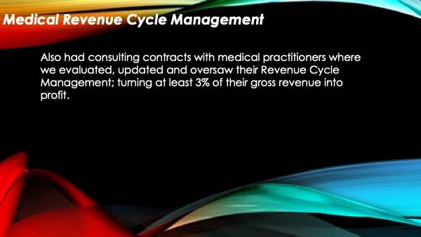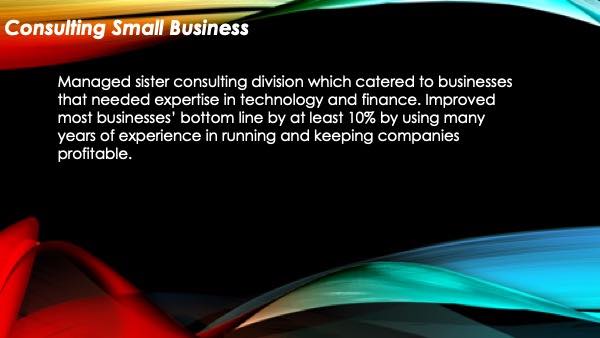 He did his job perfectly. Supplied me with backend office help like bookkeeping, payroll and human resources. John is who the consultants consult.