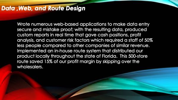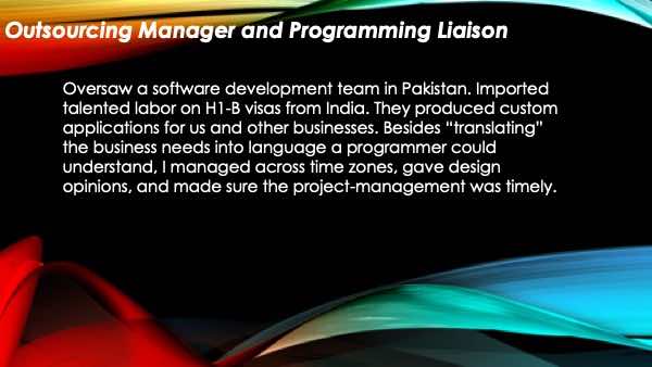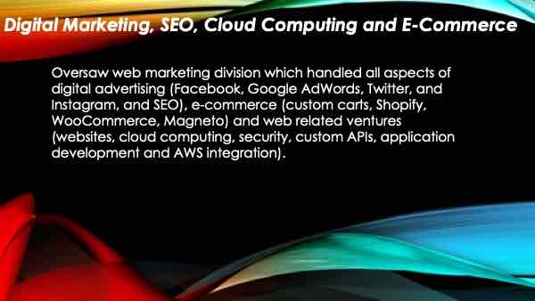For many years I have directed the software/ technical side of the business where I ran a group of programmers to develop and write code for all of our employees and customers. I have always served as the liaison between the software vendors or developers and the end users. I have personally run the IT divisions of each company that I have worked for in my career. As being AWS certified, and using Amazon Web Services, I have an expert level on most cloud technologies.