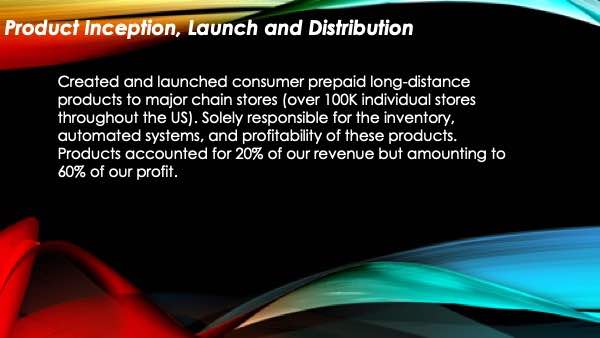 Dollars in revenue a year managedThe different postions I have held along with a small list of some of my accomplishments. Contact me for more.